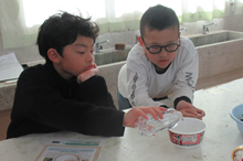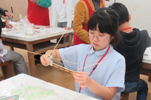 のどにあててしゃべってみたり、糸電話で話をしたりする実験もしました。そのあとリーダーが用意してくれた材料を加工して