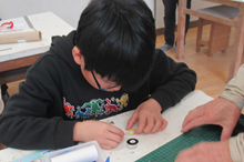 今月は、いろいろな工具を使って正確に工作することにも挑戦しました。ペットボトルに切り取り線を書いてハサミで切り取り、車輪の部品を切り出して組み立て、
