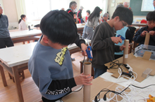 今回は、水のかわりにビー玉を使った「ししおどし」を作りました。講座の前に廊下でノコギリと電動ドリルの使い方を体験しました。